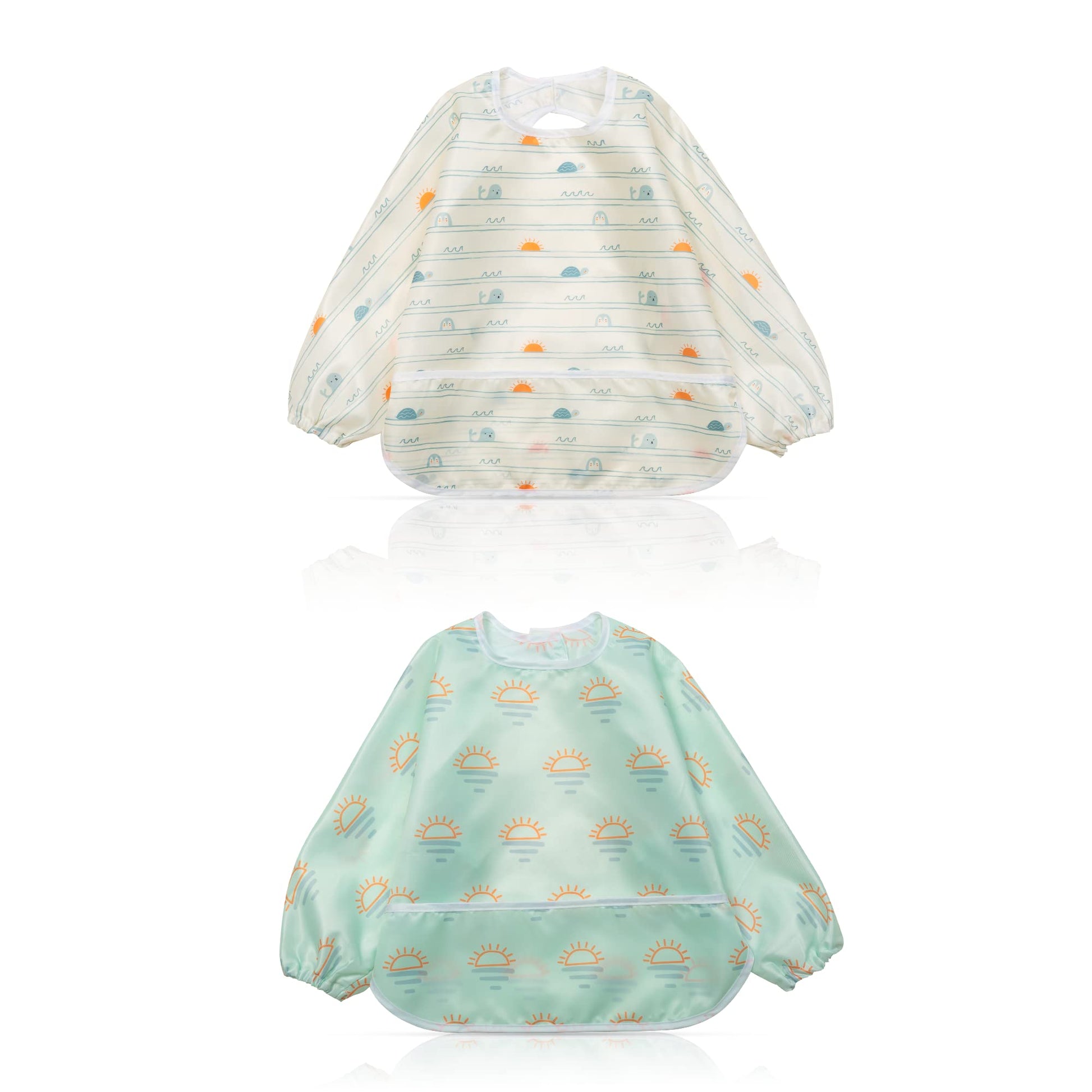 Little Dimsum Mess-Proof Baby Bibs|Infant Toddler Long Sleeve Waterproof Feeding Art Smock|Catching Food & Wipe Clean| Pack of 2 Colors (turtle&sun)